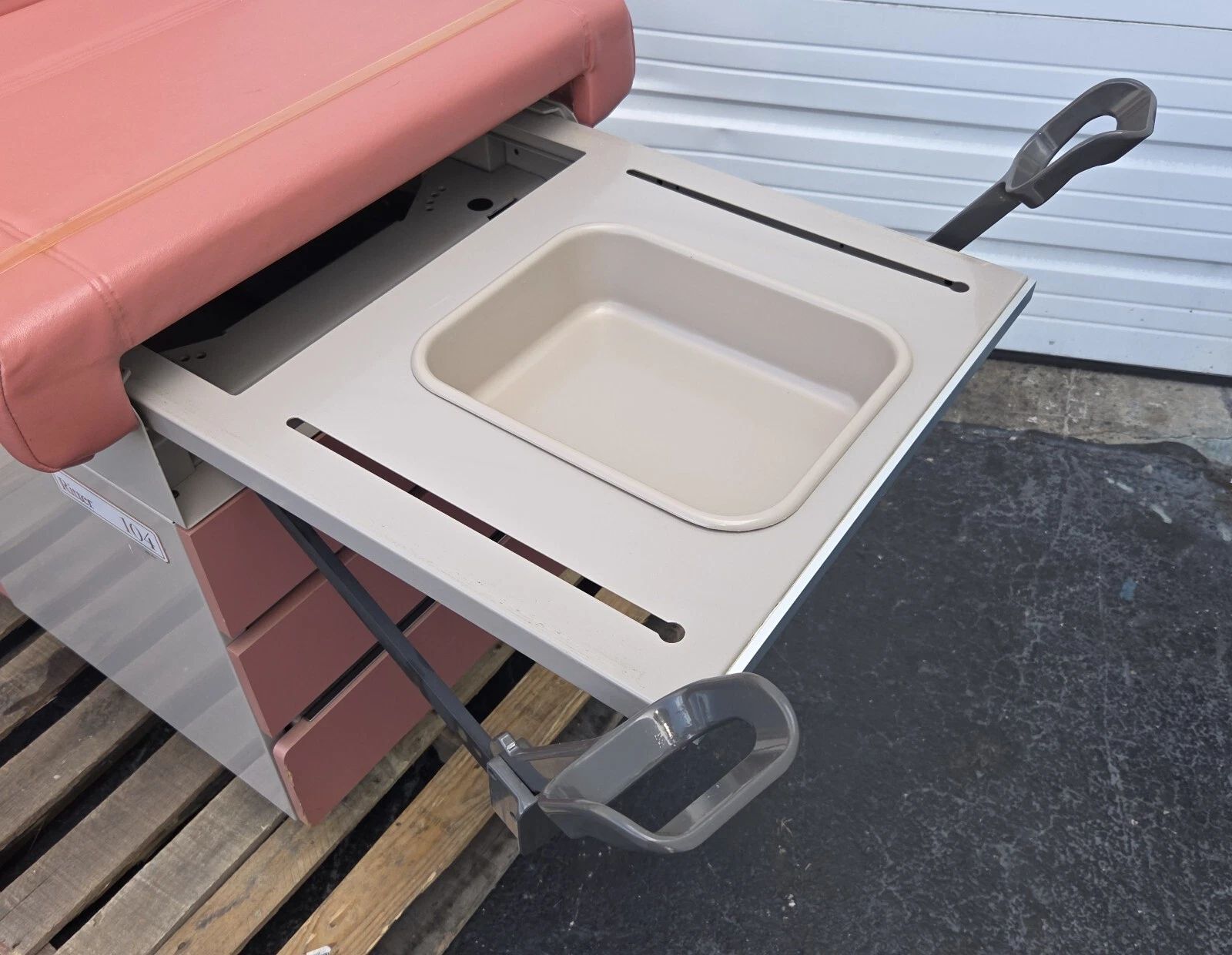 This is an examination table that is very quiet and very smooth. It has plastic covered stirrups and a wash basin.