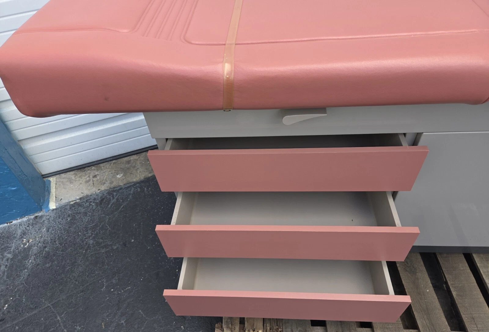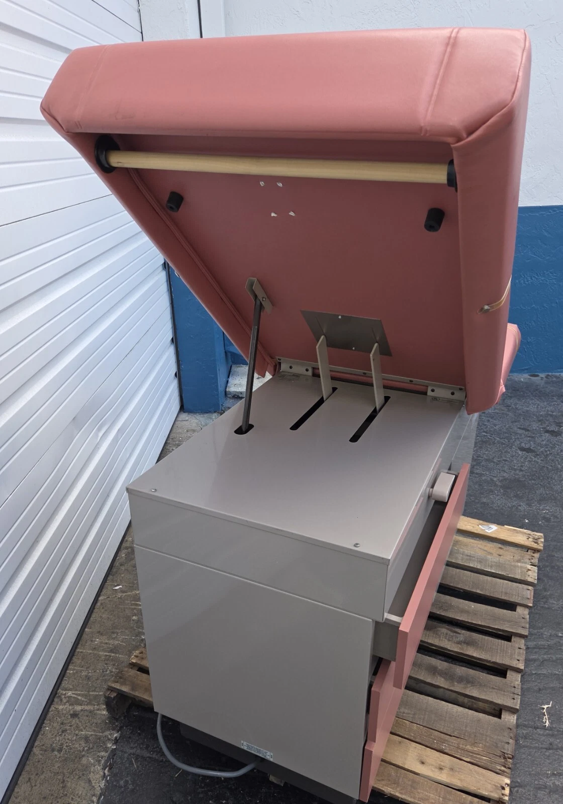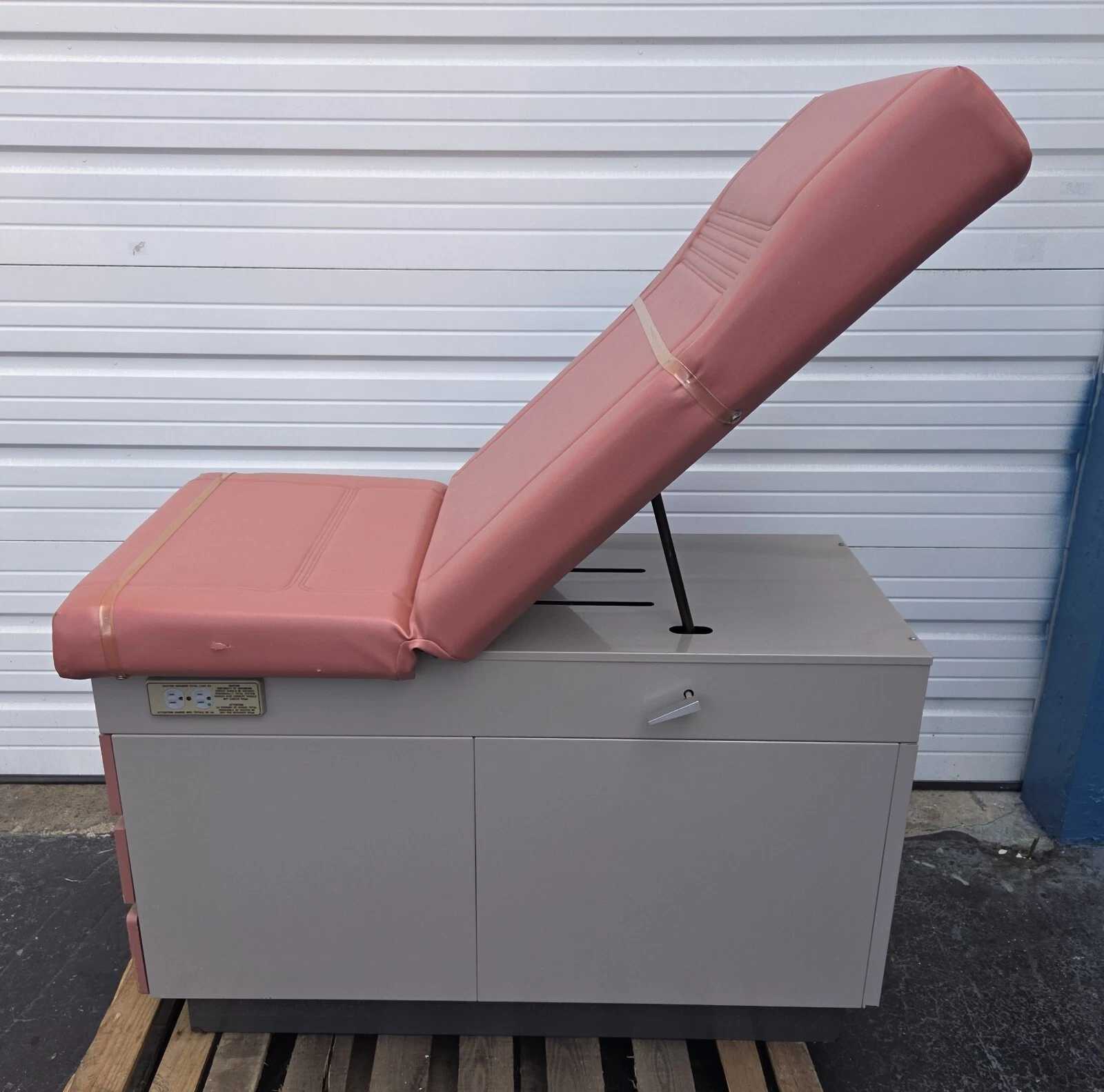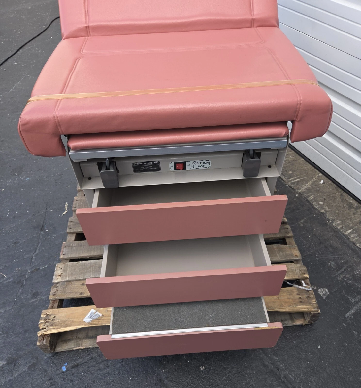 As can be seen in the images of this offer the elevation, the angle of the back rest of the table, the legs section and the tilt of the table are adjustable. The top drawer at the end of this table has a heating mechanism to keep the specula warm. There is an electrical outlet on the side of the table for lamps and other accessories.